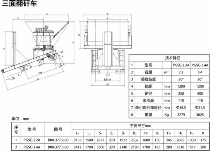三面翻矸車用途: 排矸系統(tǒng)設備適用于矸石山裝卸矸石用。其生產工序為:重車出井由電機車推至翻車機車間,通過裝載扇形閘門卸入裝載設備,由絞車牽引至卸矸架卸矸,卸矸完成后絞車反轉,裝載設備行至裝載扇形閘門下部等待下一工序。